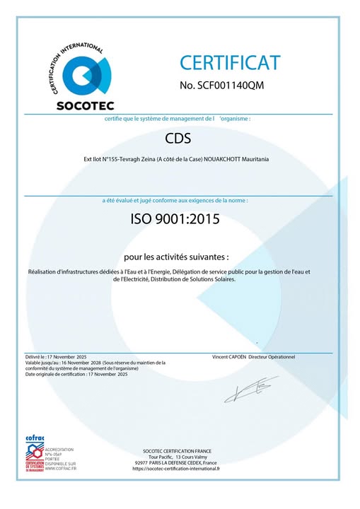 décembre 6, 2025 admin 0 Comments Nous sommes heureux d’annoncer l’obtention de la certification internationale de qualité ISO 9001:2015.Cette réussite témoigne de notre engagement indéfectible envers les plus hauts standards de qualité et d’excellence organisationnelle.